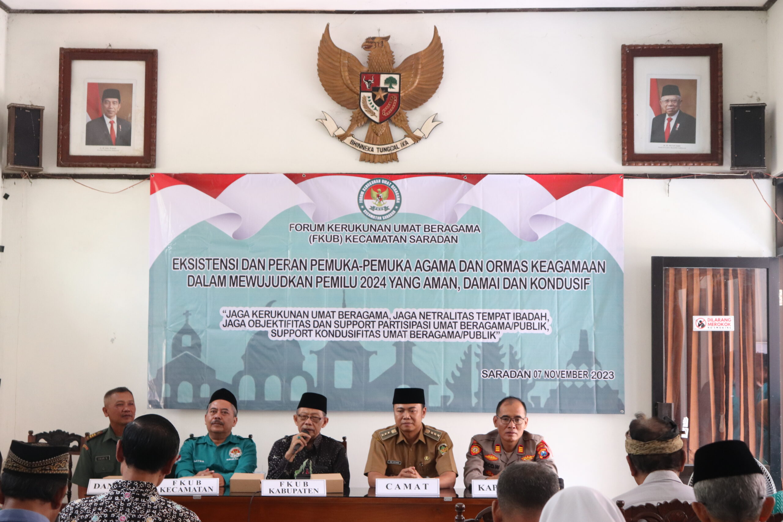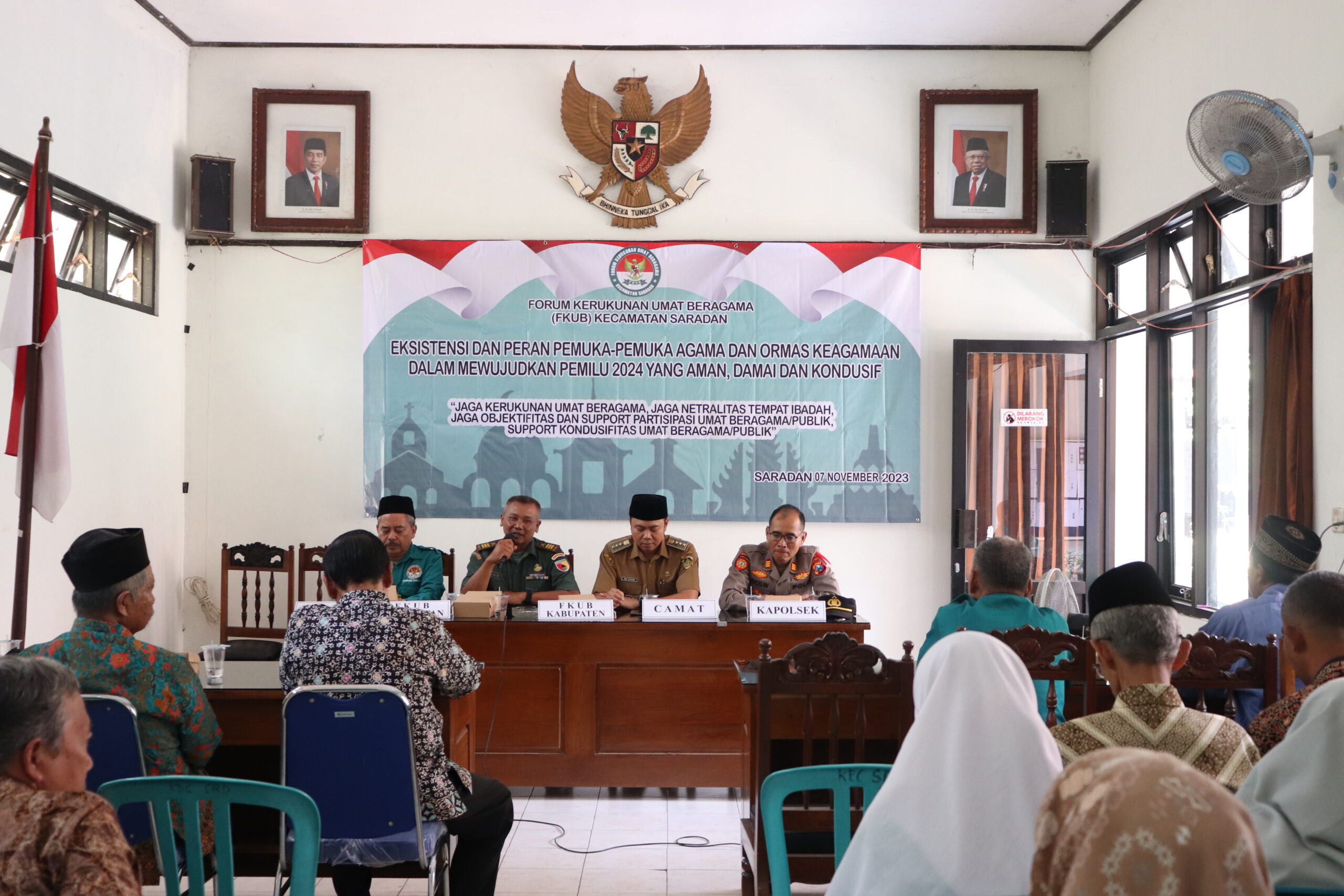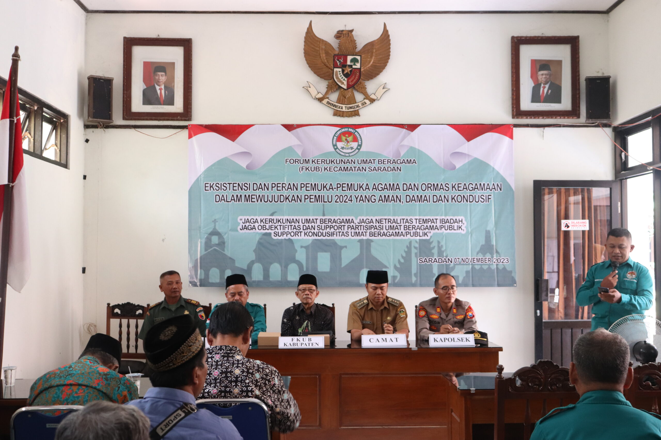Ketua Forum Kerukunan Umat Beragama (FKUB) Kabupaten Madiun KH Muharromain, mengungkapkan peran dan tanggung jawab Pemuka-pemuka agama dan ormas keagamaan untuk mewujudkan pemilu serentak 2024 yang aman kondusif dan damai. Hal ini disampaikan dalam sambutan pada acara sosialisasi/ konsolidasi pengurus FKUB Kecamatan Saradan dan Pengurus FKUB Desa Se Kecamatan Saradan yang bertajuk “ Eksistensi Dan Peran Pemuka-Pemuka Agama Dan Ormas Keagamaan Dalam Mewujudkan Pemilu 2024 Yang Aman, Damai Dan Kondusif ” di Kantor Kecamatan Saradan pada Selasa (07/11/2023).
