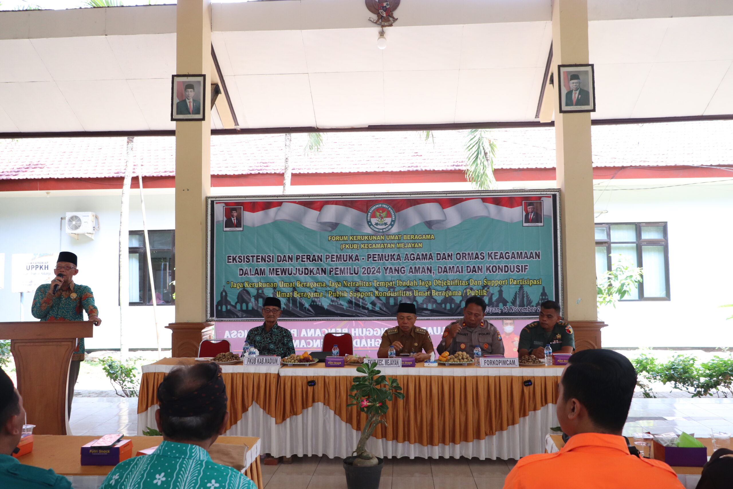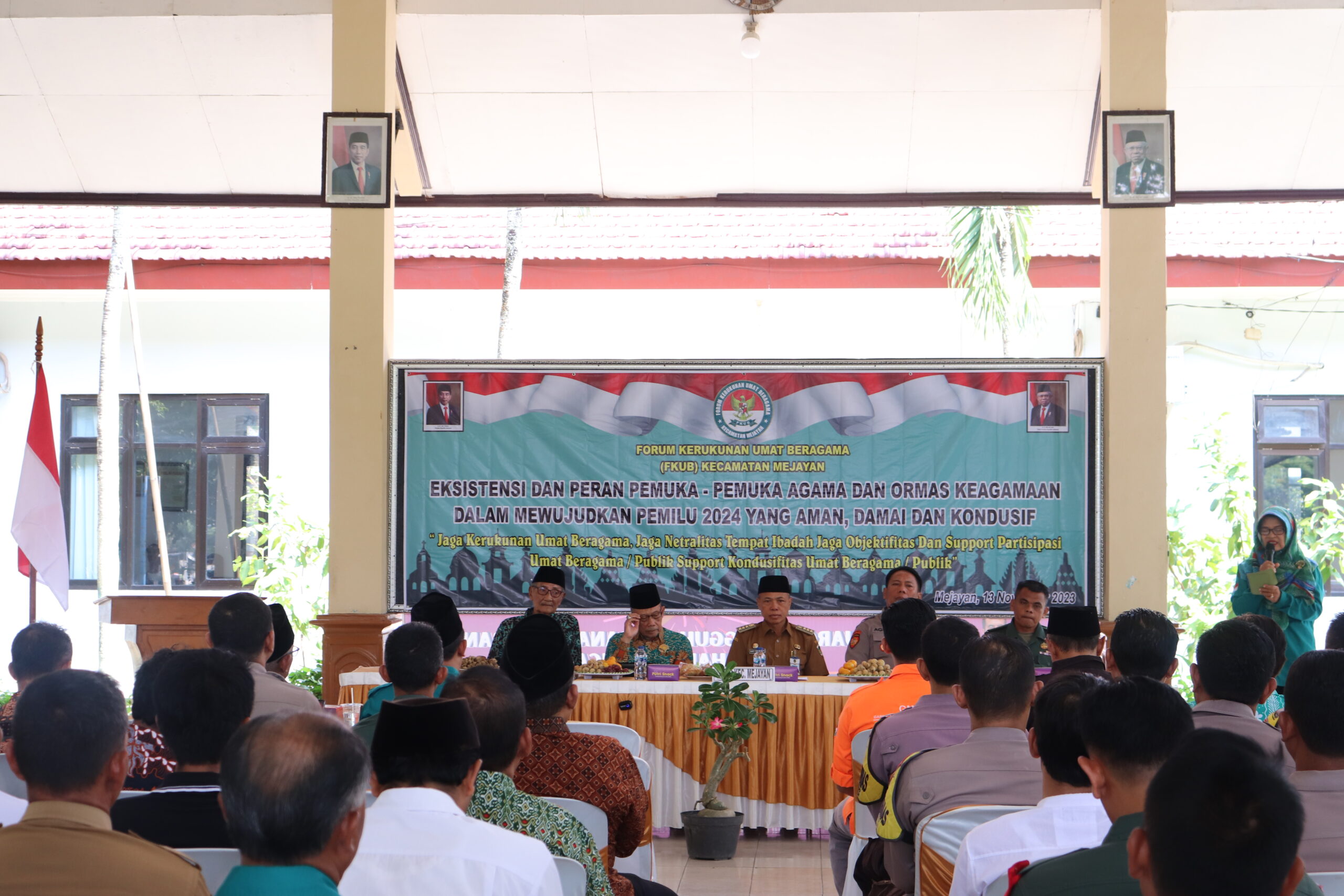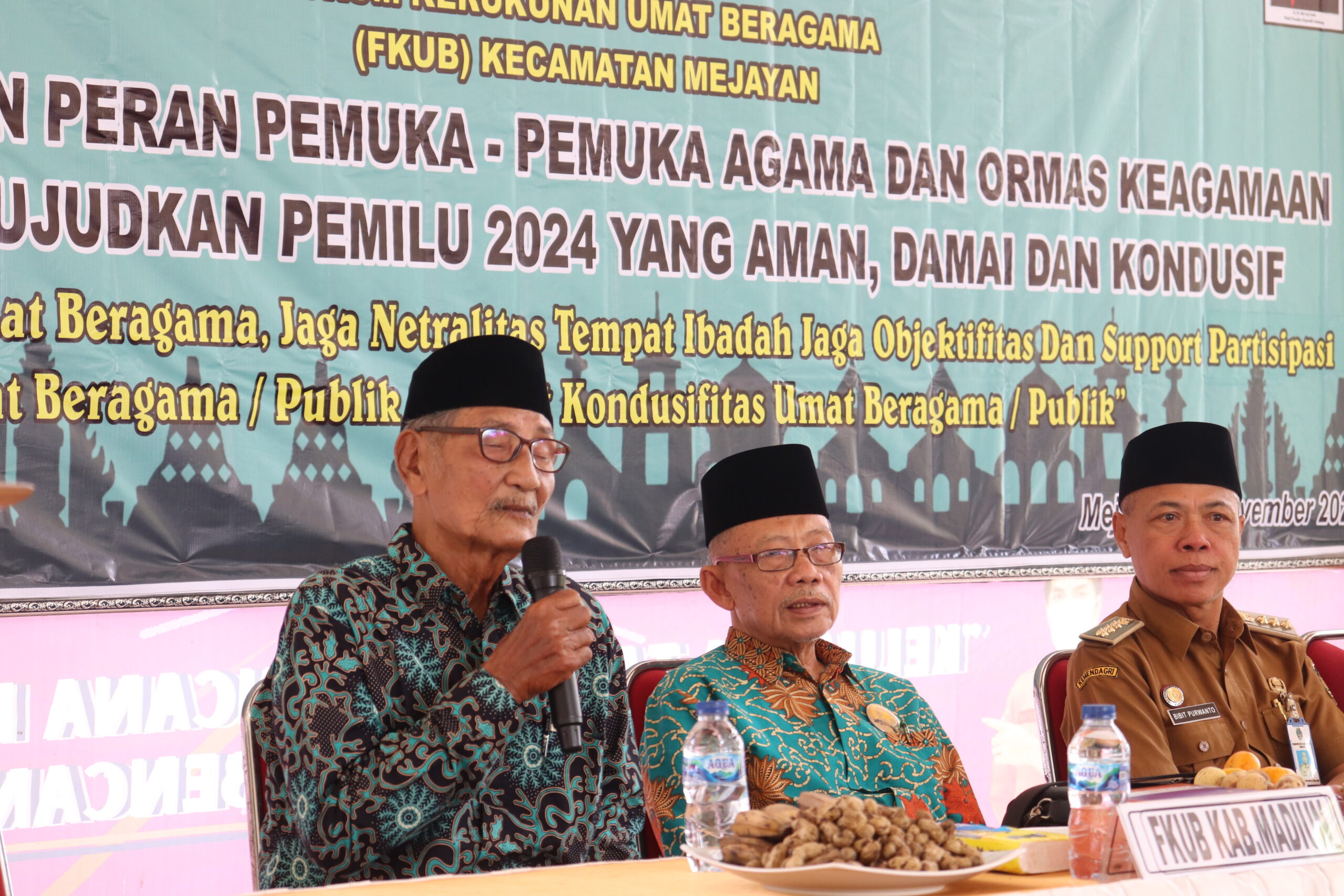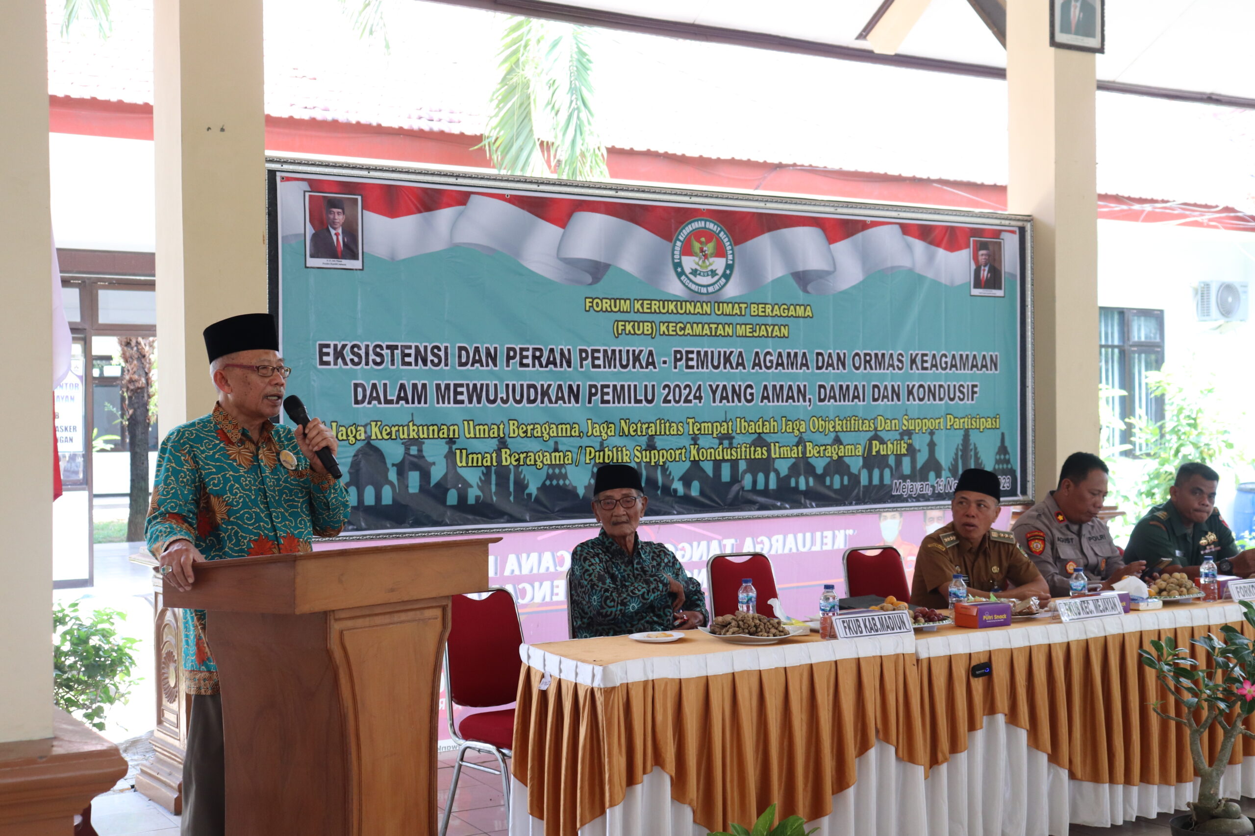 Camat Kecamatan Mejayan Bibit Purwanto, S.Sos., M.Si berharap FKUB dapat menyongsong kesuksesan pemilu 2024, harus bisa eksis dalam kekompakan guyub rukun jangan sampai dengan pesta demokrasi ini malah menjadikan pecah belah. Untuk itu mari terus kita tingkatkan kekompakan dan guyub rukun untuk menyukseskan pemilu 2024 agar berjalan dengan aman, lancar, tertib dan masyarakat tetap aman dan kondusif. Ia juga mengatakan FKUB dan para tokoh agama harus bisa memberikan wawasan dan edukasi berkaitan dengan pemilu, agar dalam pemilu 2024 nanti tingkat kehadiran dapat maksimal terlebih jika bisa 100%. Ia juga berharap masukan dan saran-saran serta arahan, bagaimana nanti peran FKUB beserta tokoh agama dalam memberikan kontribusi yang terbaik untuk masyarakat.