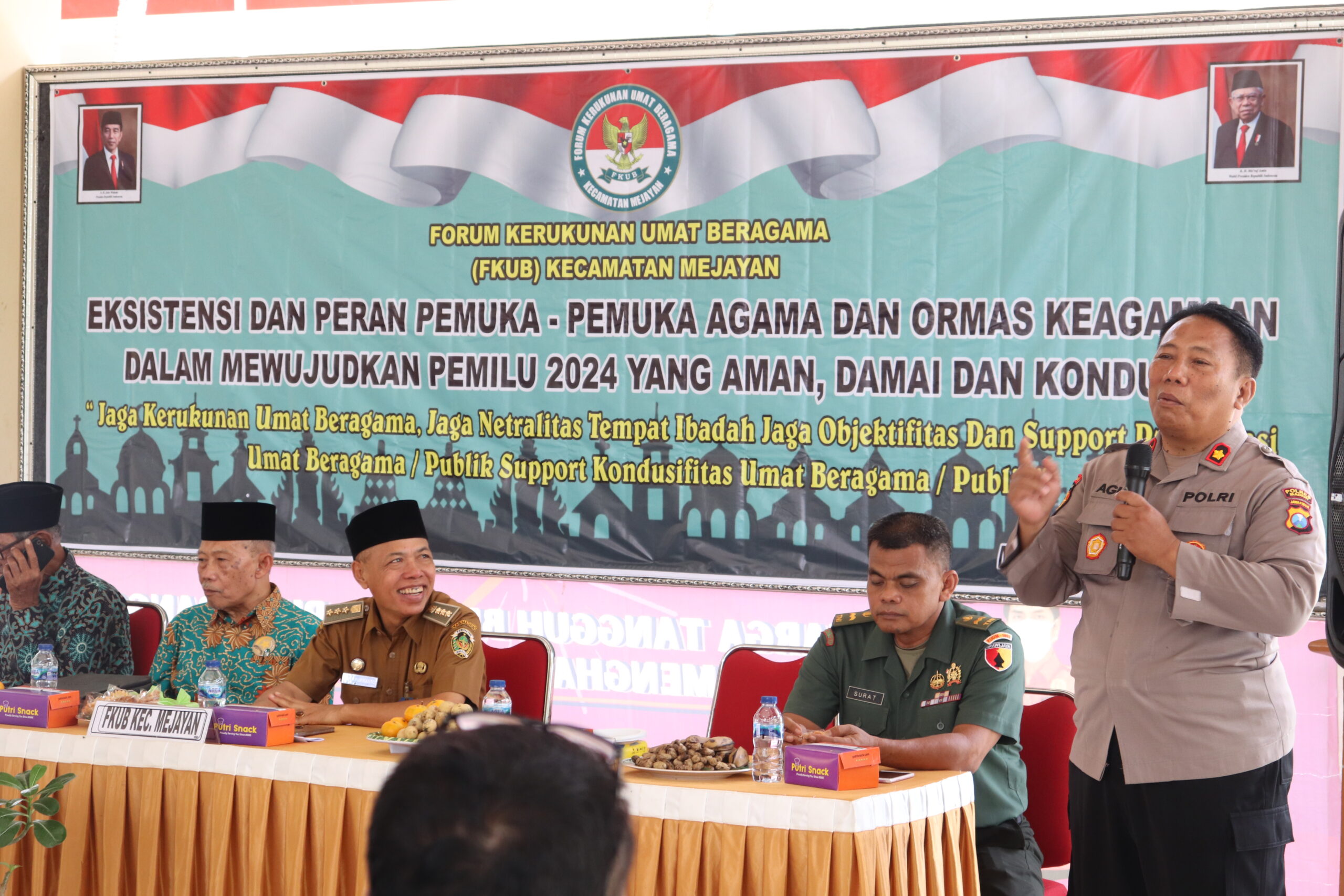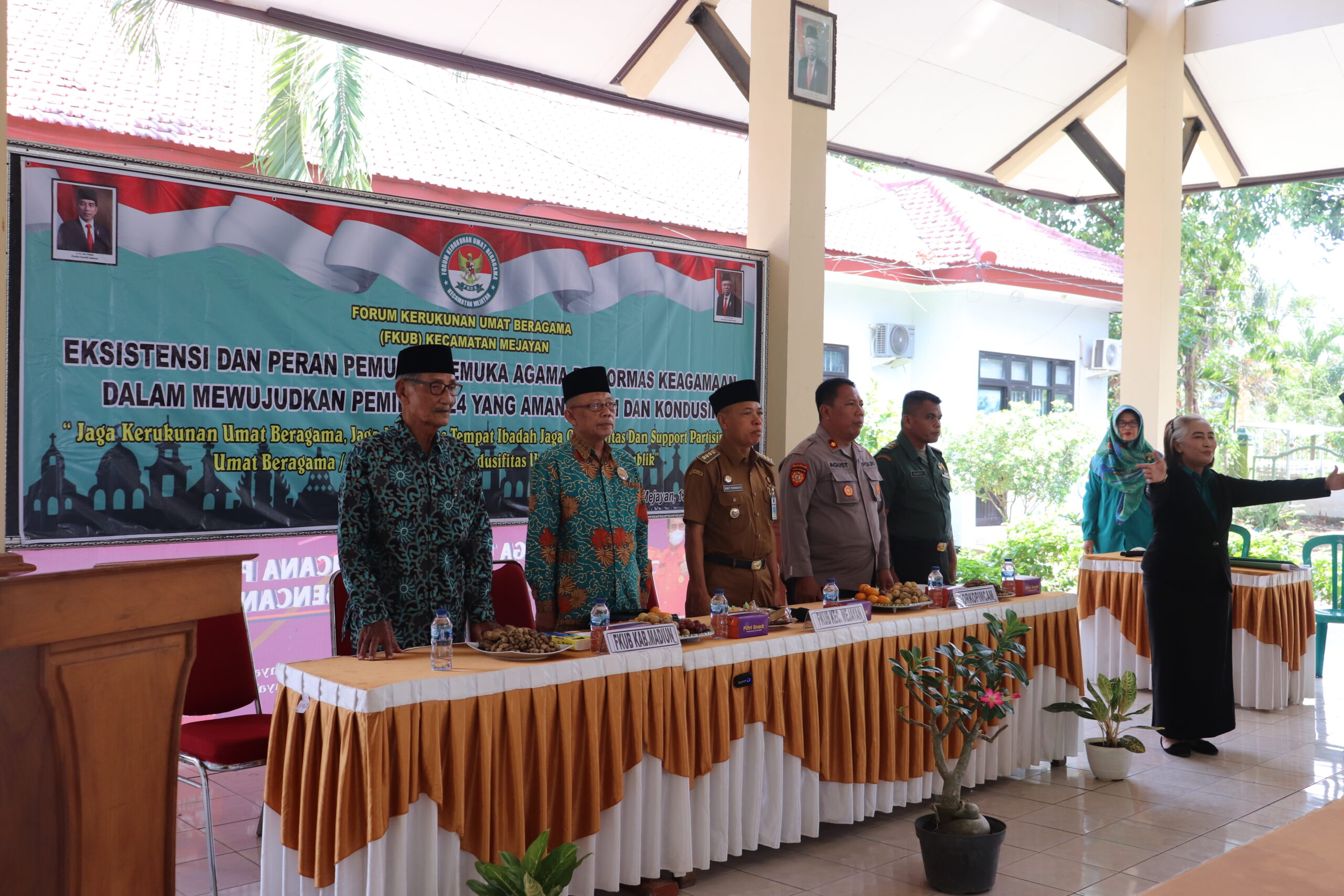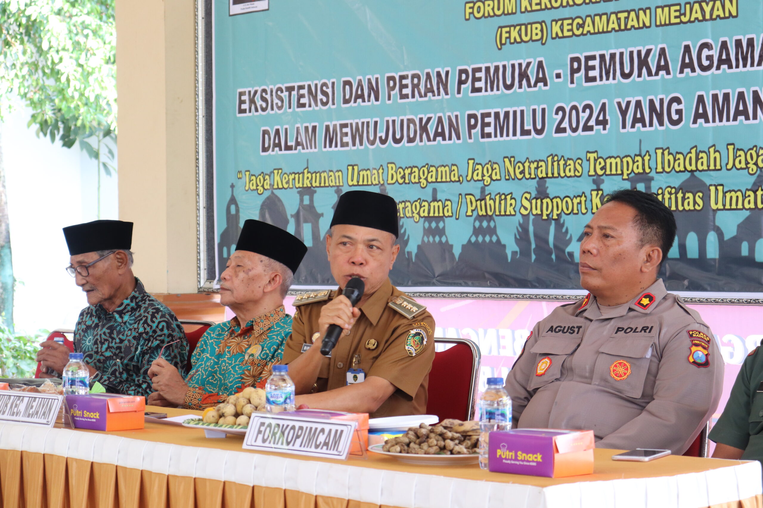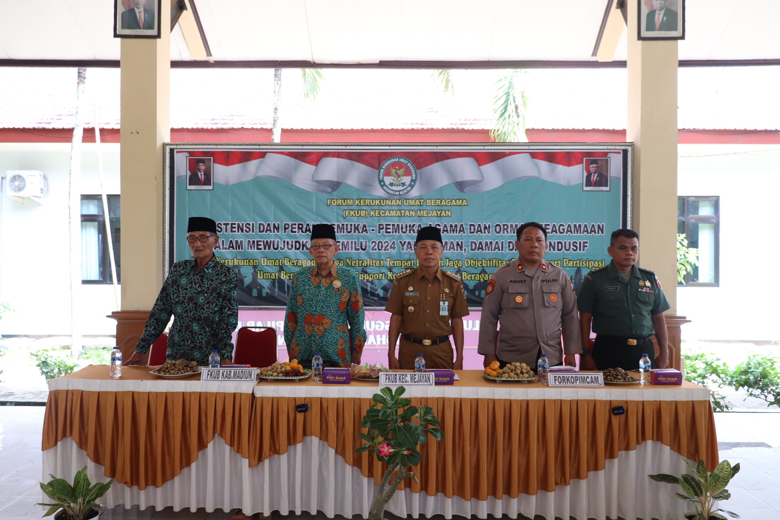 Camat Kecamatan Mejayan Bibit Purwanto, S.Sos., M.Si berharap FKUB dapat menyongsong kesuksesan pemilu 2024, harus bisa eksis dalam kekompakan guyub rukun jangan sampai dengan pesta demokrasi ini malah menjadikan pecah belah. Untuk itu mari terus kita tingkatkan kekompakan dan guyub rukun untuk menyukseskan pemilu 2024 agar berjalan dengan aman, lancar, tertib dan masyarakat tetap aman dan kondusif. Ia juga mengatakan FKUB dan para tokoh agama harus bisa memberikan wawasan dan edukasi berkaitan dengan pemilu, agar dalam pemilu 2024 nanti tingkat kehadiran dapat maksimal terlebih jika bisa 100%. Ia juga berharap masukan dan saran-saran serta arahan, bagaimana nanti peran FKUB beserta tokoh agama dalam memberikan kontribusi yang terbaik untuk masyarakat.