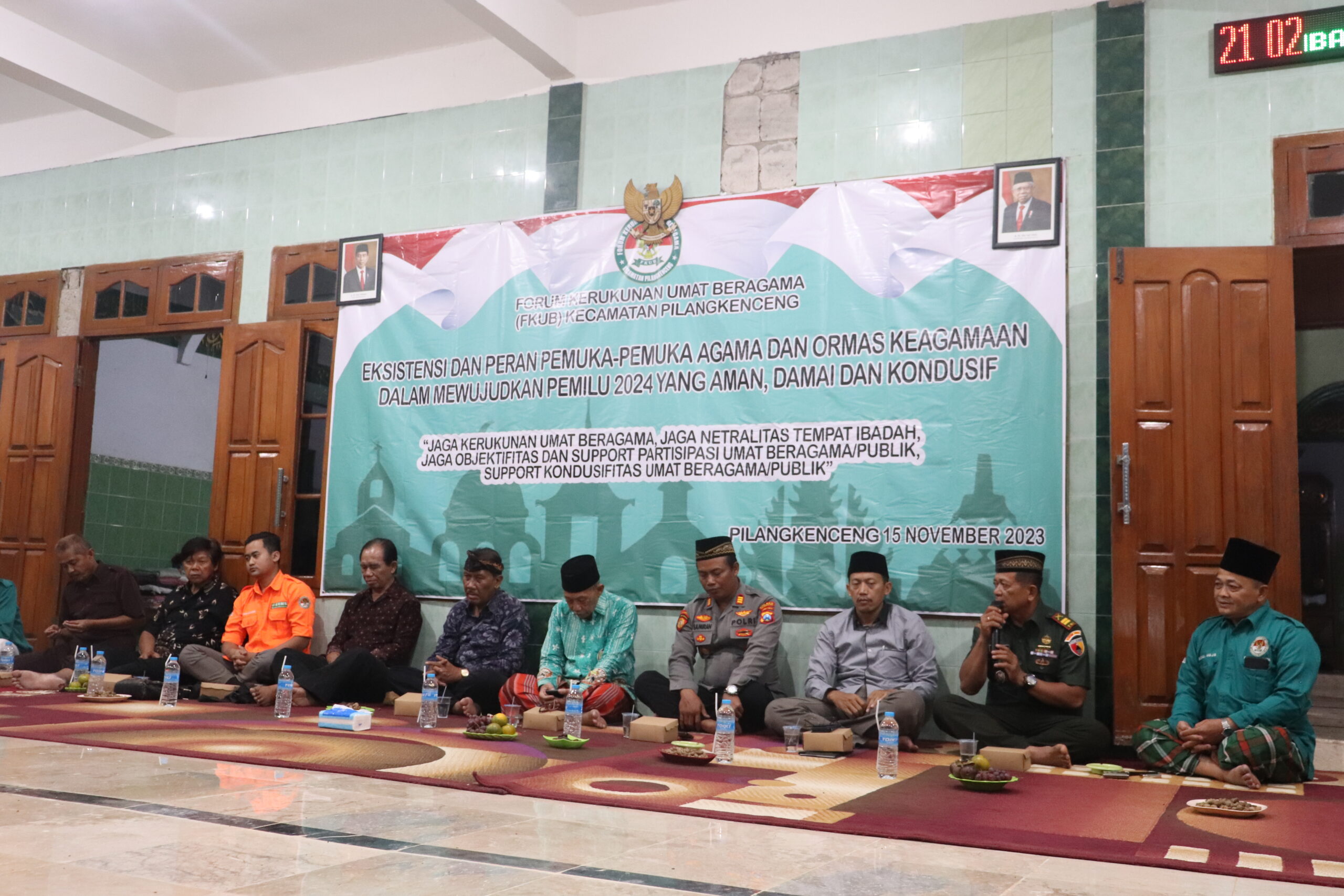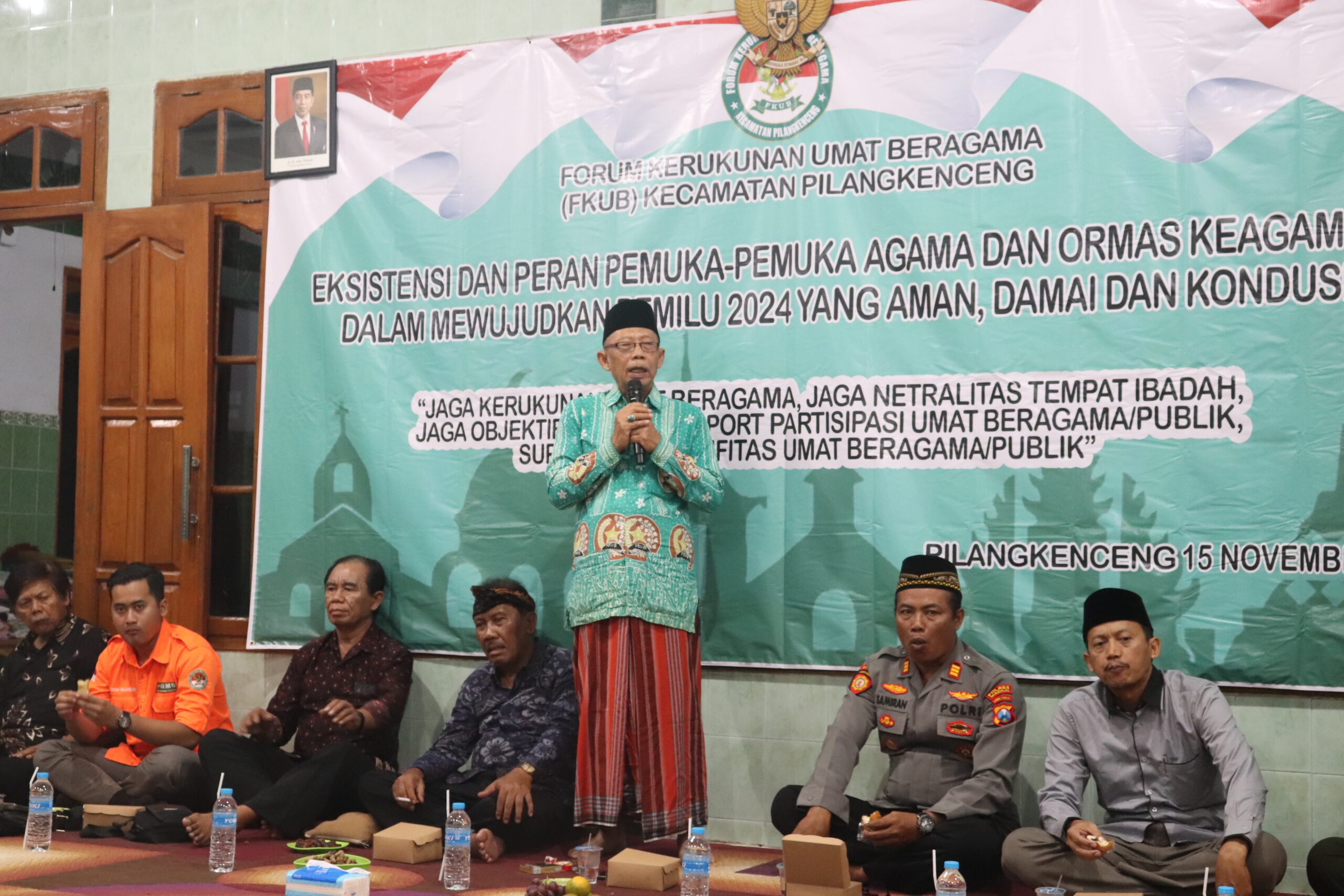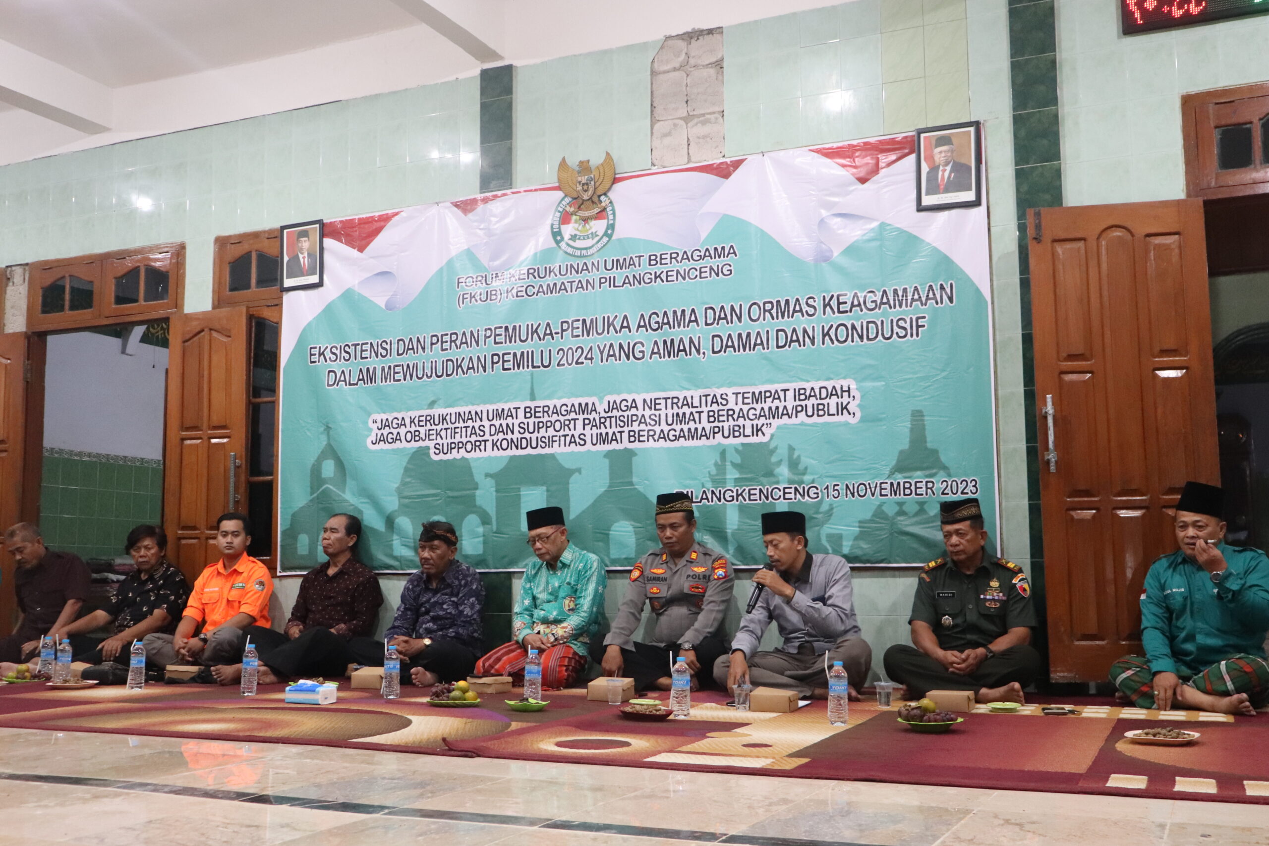 Ketua Forum Kerukunan Umat Beragama (FKUB) Kecamatan Pilangkenceng, KH Abdul Mujib, menyampaikan bahwa FKUB Kecamatan Pilangkenceng telah menyelenggarakan kegiatan sarasehan guna menciptakan kondisi yang kondusif menjelang acara 5 tahunan. Tujuan utama dari kegiatan ini adalah agar pelaksanaan pilpres, pileg, dan kegiatan lainnya pada tahun 2024 dapat berjalan dengan aman dan tenteram. Pada kesempatan tersebut, beliau menyampaikan pesan ini dalam sambutannya saat sosialisasi dan konsolidasi pengurus FKUB Kecamatan Pilangkenceng yang bertemakan “Eksistensi Dan Peran Pemuka-Pemuka Agama Dan Ormas Keagamaan Dalam Mewujudkan Pemilu 2024 Yang Aman, Damai, Dan Kondusif”, yang dilaksanakan di Pondok Pesantren Bahrur Rohim Wonoayu Kecamatan Pilangkenceng(15/11/2023).