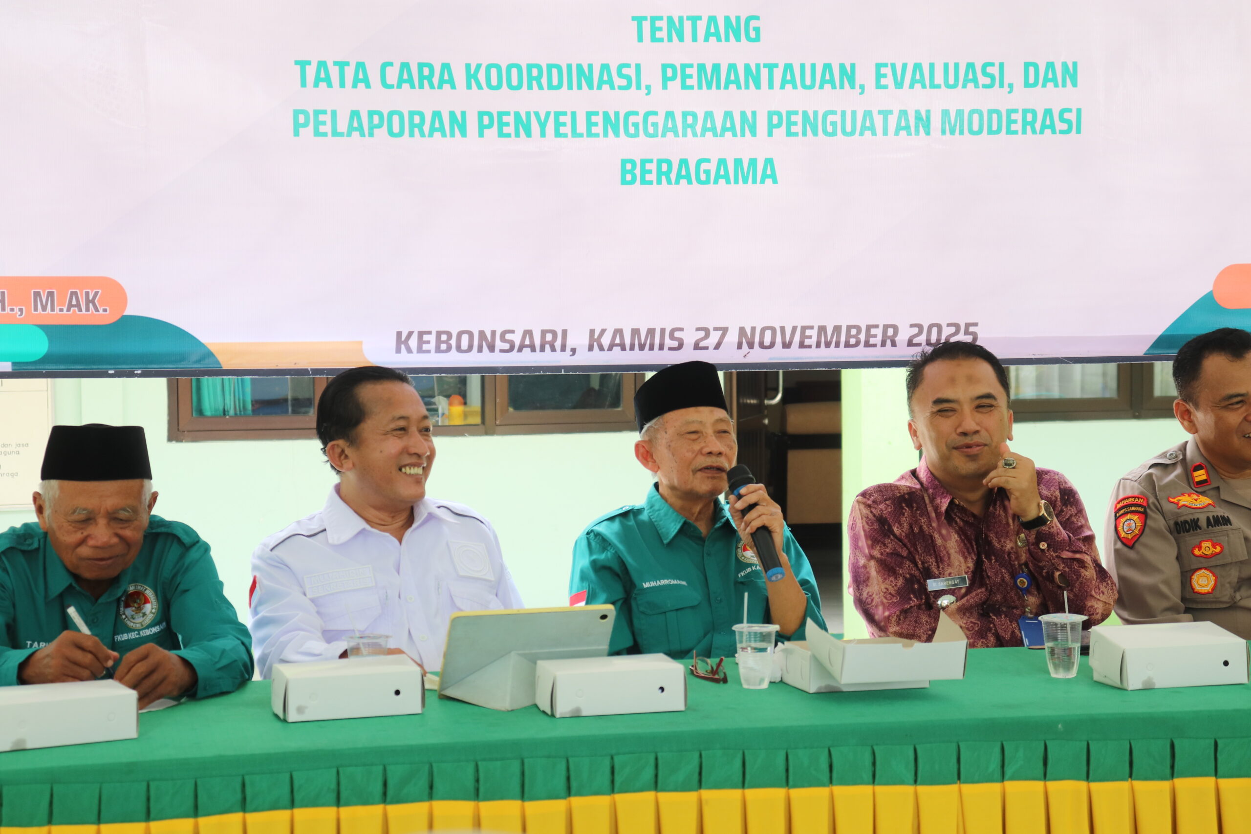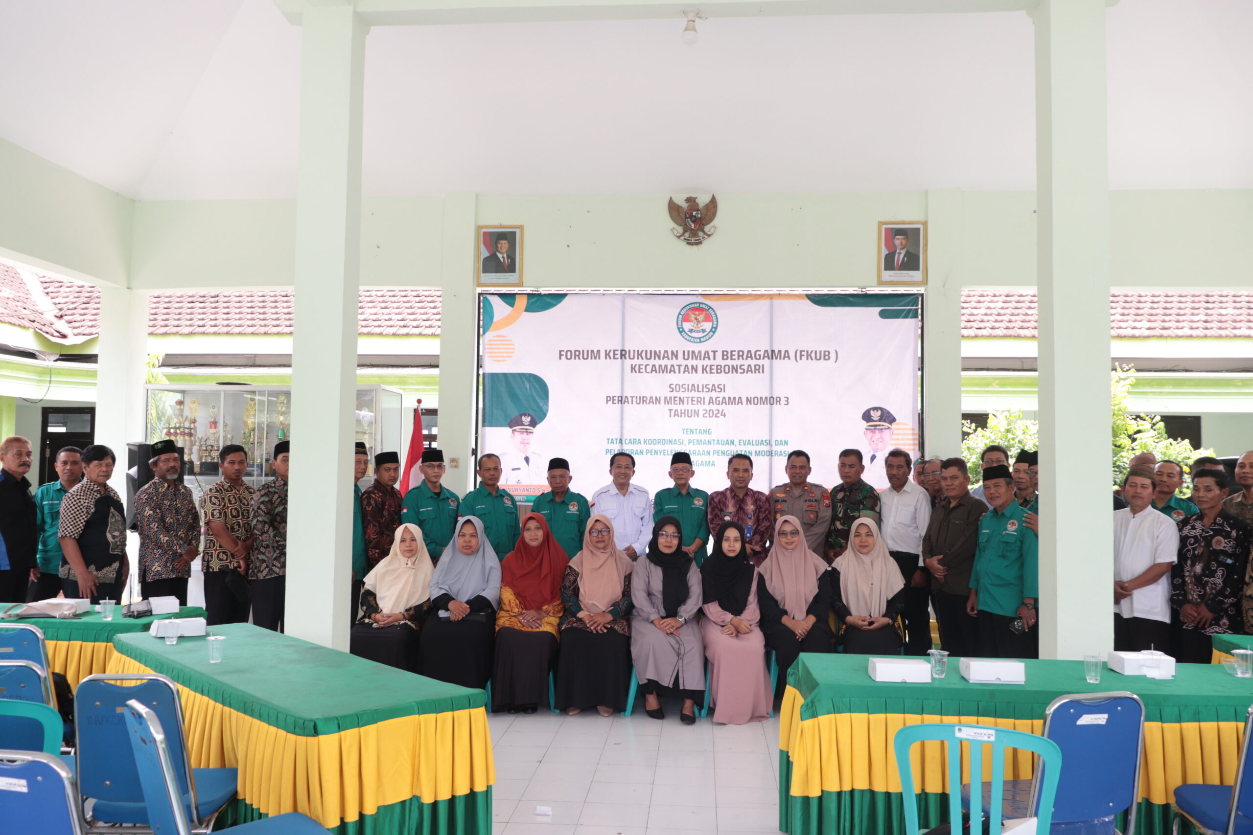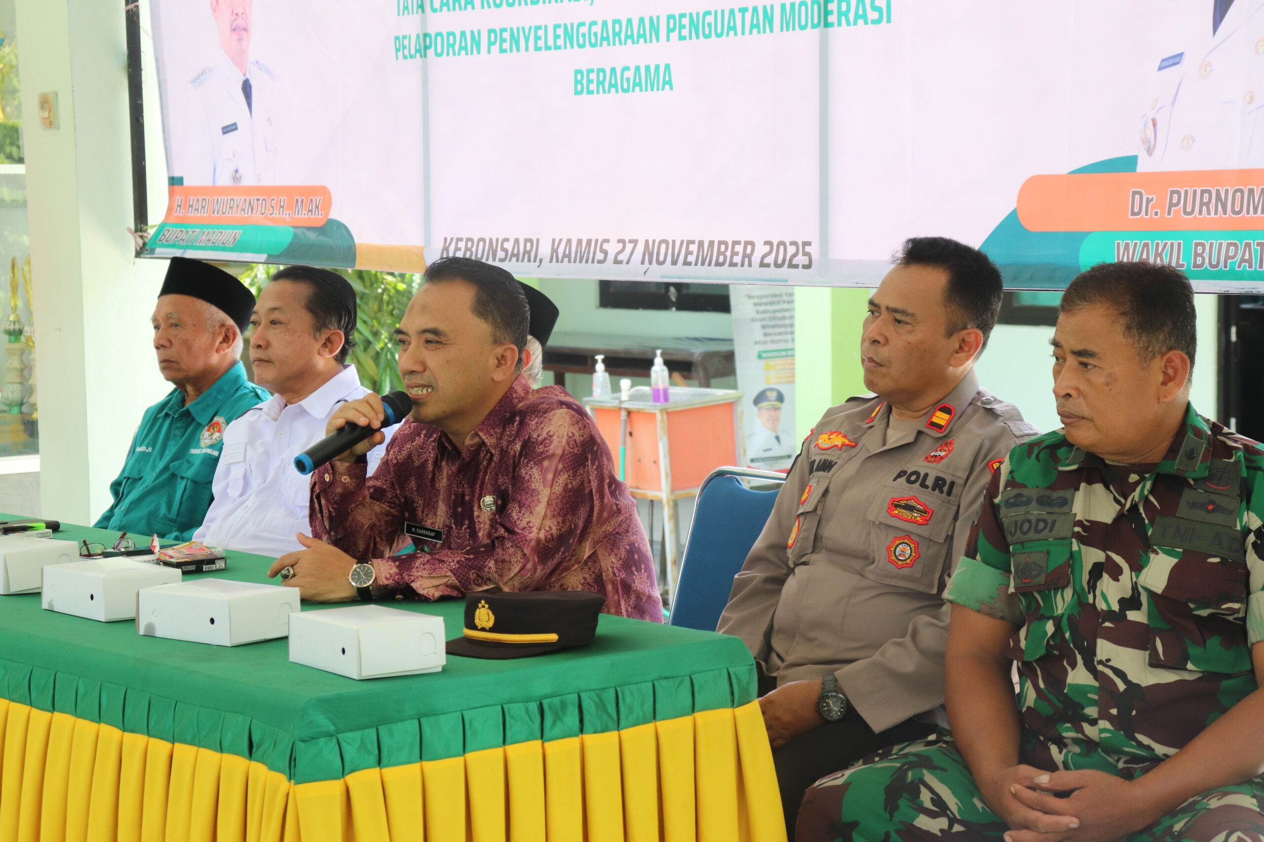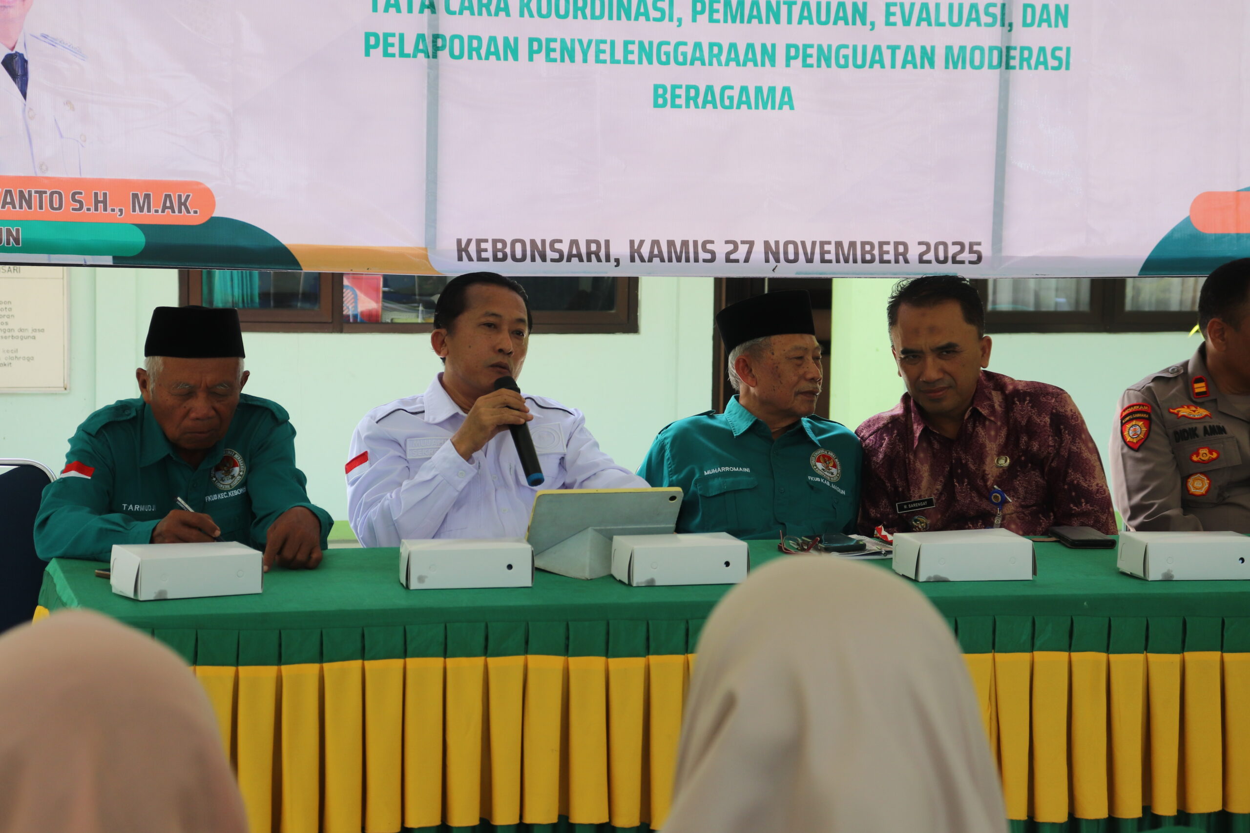 MADIUN — Forum Kerukunan Umat Beragama (FKUB) Kecamatan Kebonsari menggelar sosialisasi Peraturan Menteri Agama (PMA) Nomor 3 Tahun 2024 tentang tata cara koordinasi, pemantauan, evaluasi, dan pelaporan penyelenggaraan penguatan moderasi beragama, di Kecamatan Kebonsari, Kabupaten Madiun, Kamis (27/11/2025).