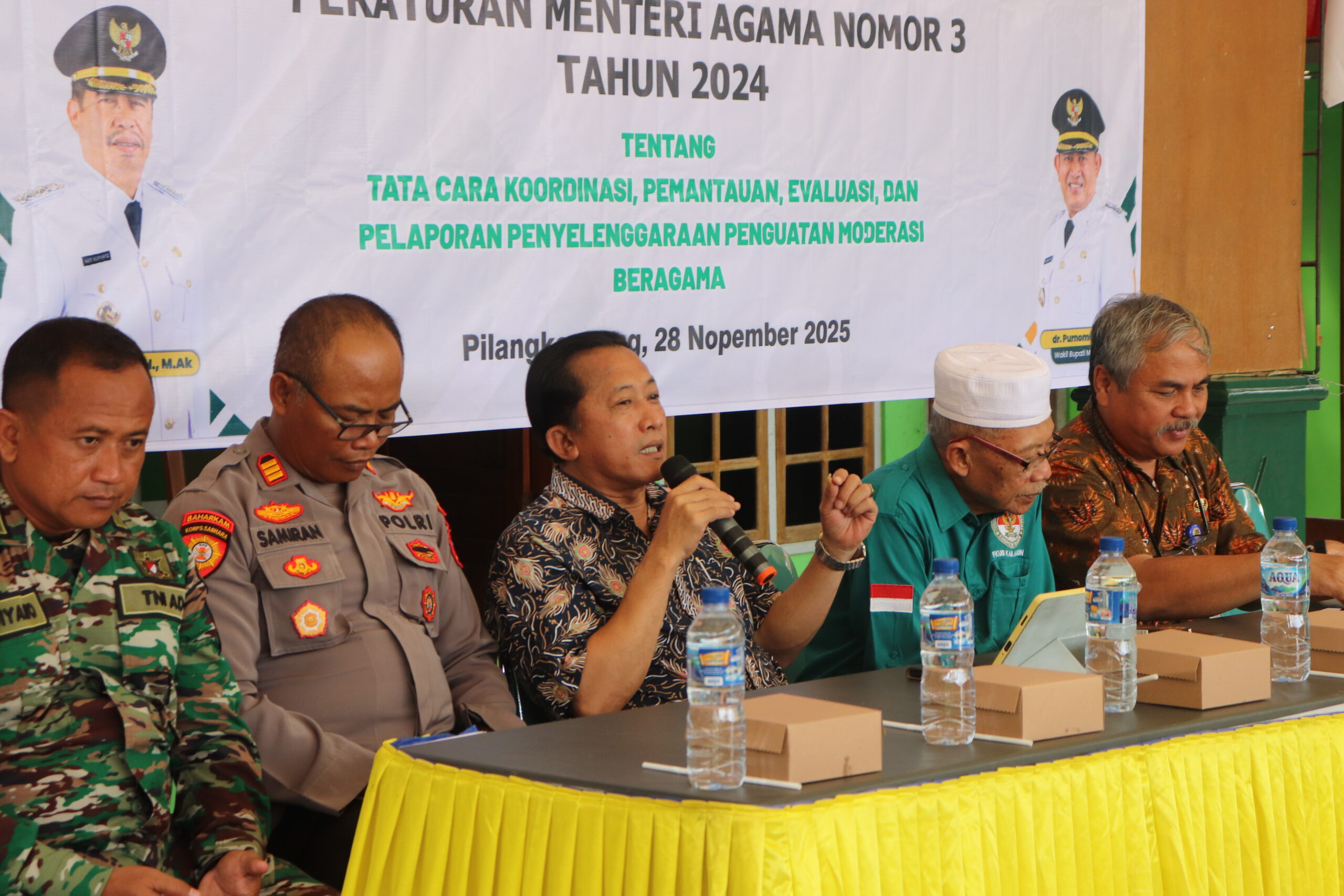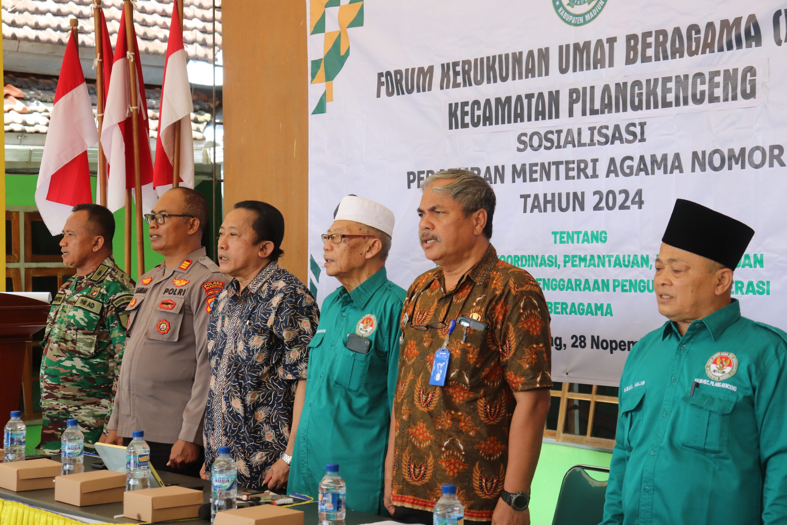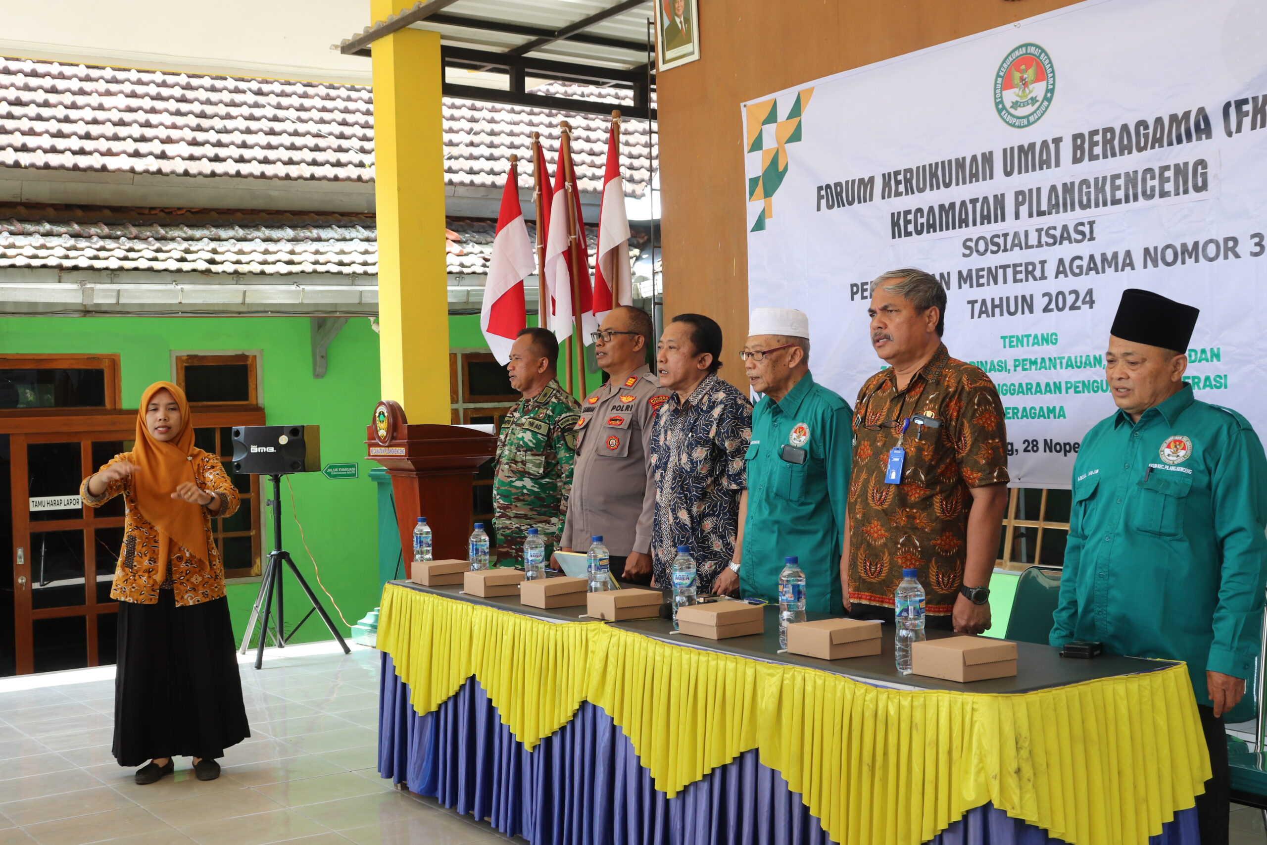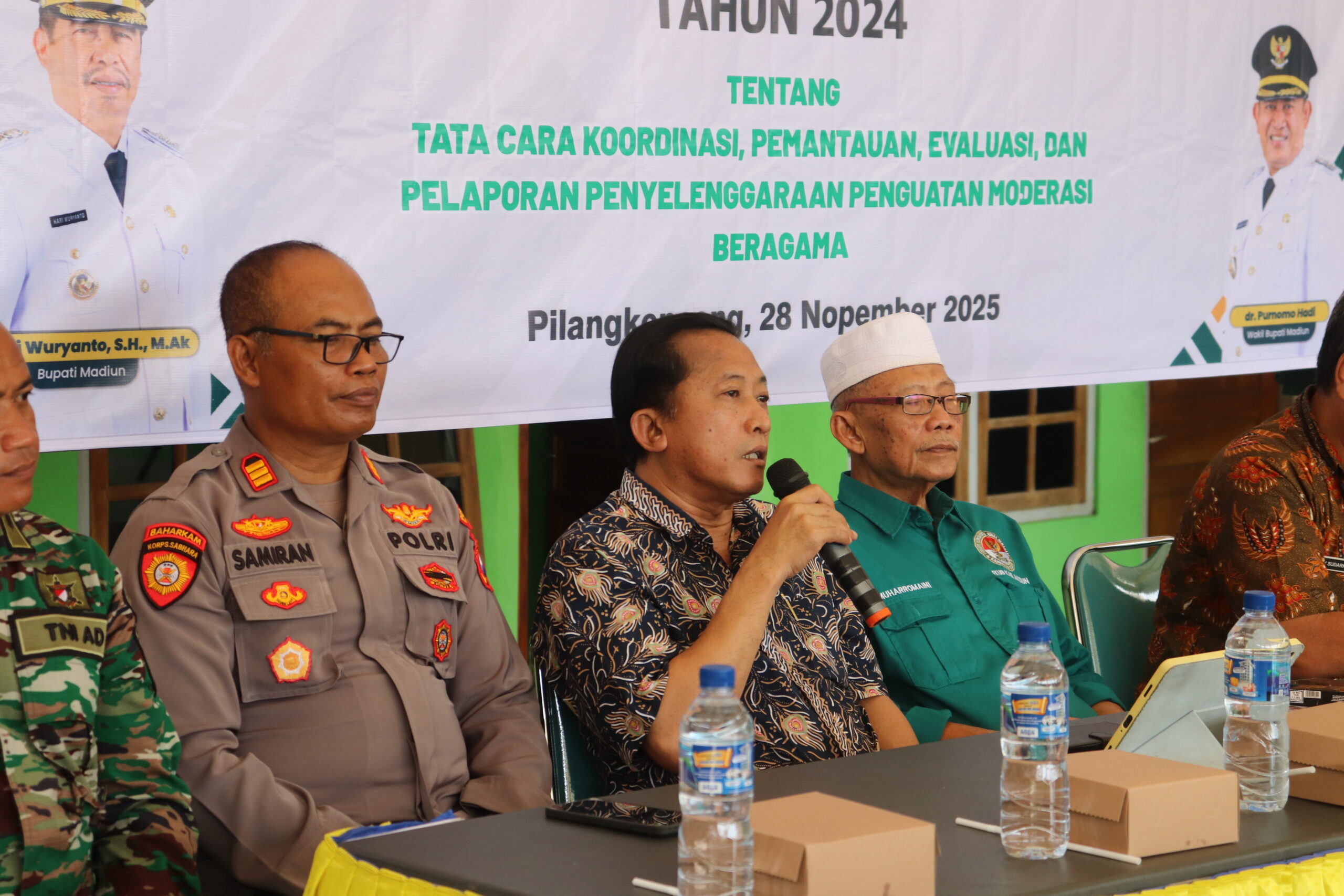 MADIUN — Forum Kerukunan Umat Beragama (FKUB) Kecamatan Pilangkenceng menggelar sosialisasi Peraturan Menteri Agama (PMA) Nomor 3 Tahun 2024 tentang tata cara koordinasi, pemantauan, evaluasi, dan pelaporan penyelenggaraan penguatan moderasi beragama, bertempat di Pendopo Kecamatan Pilangkenceng, Jumat (28/11/2025).